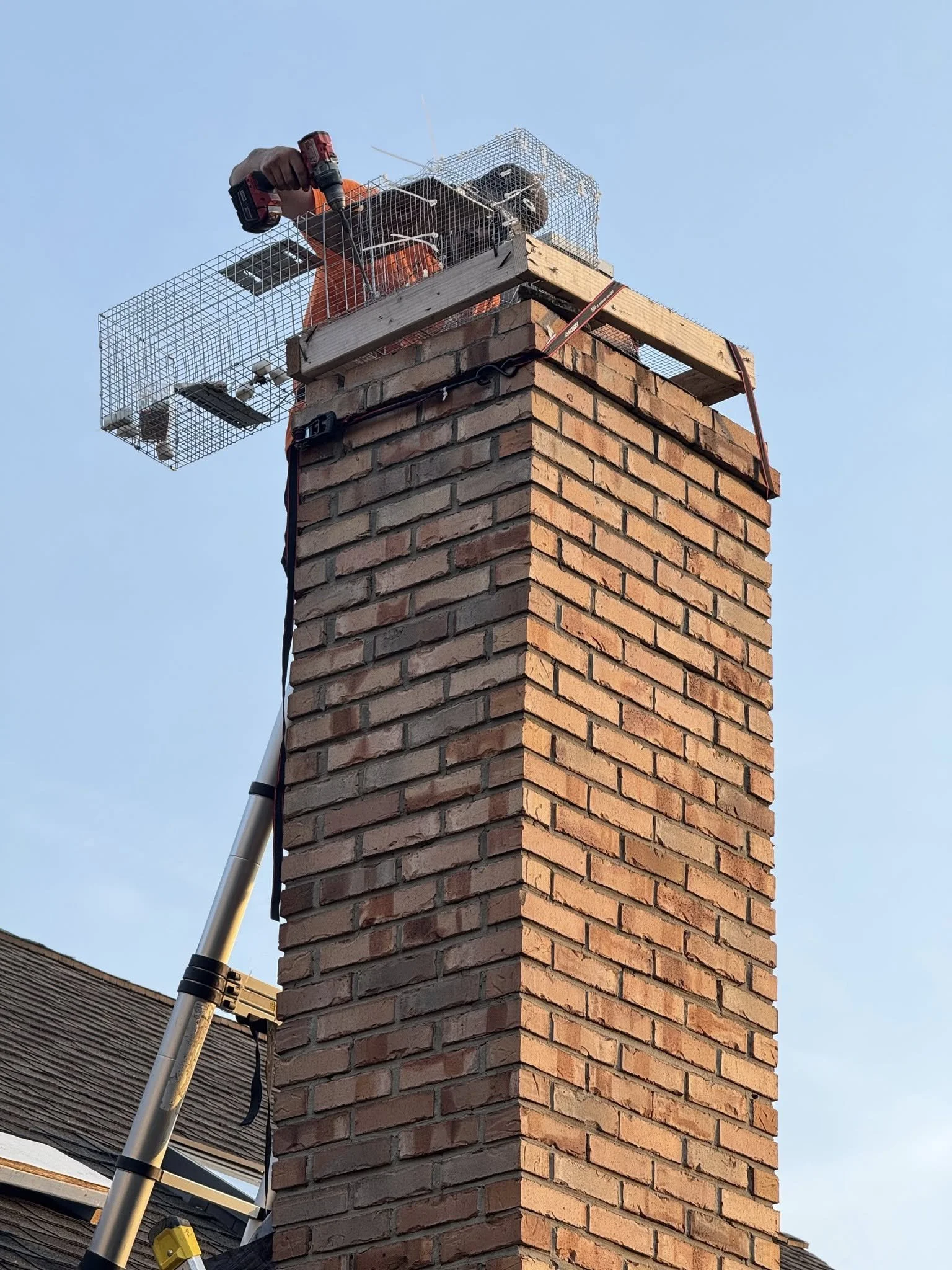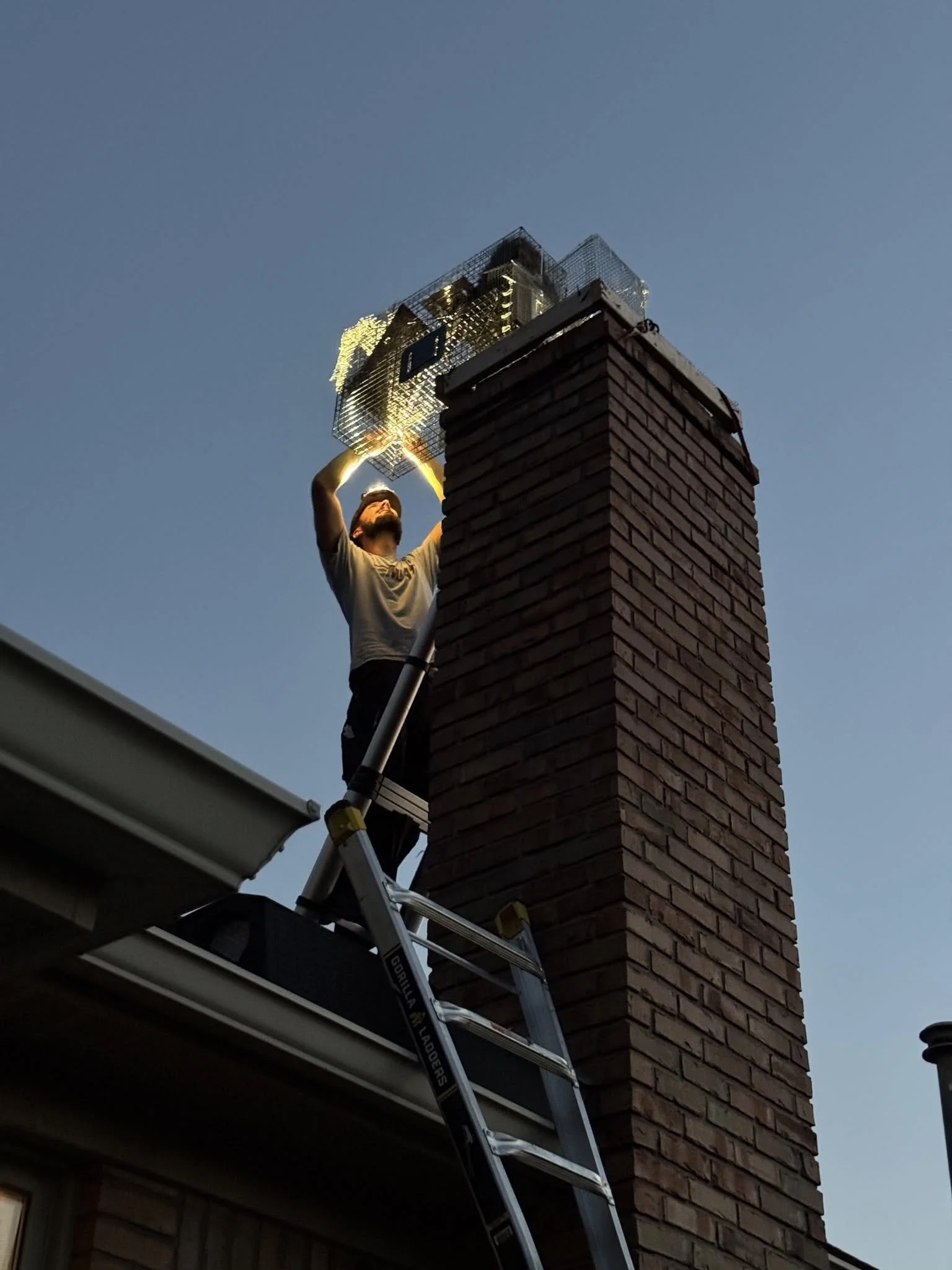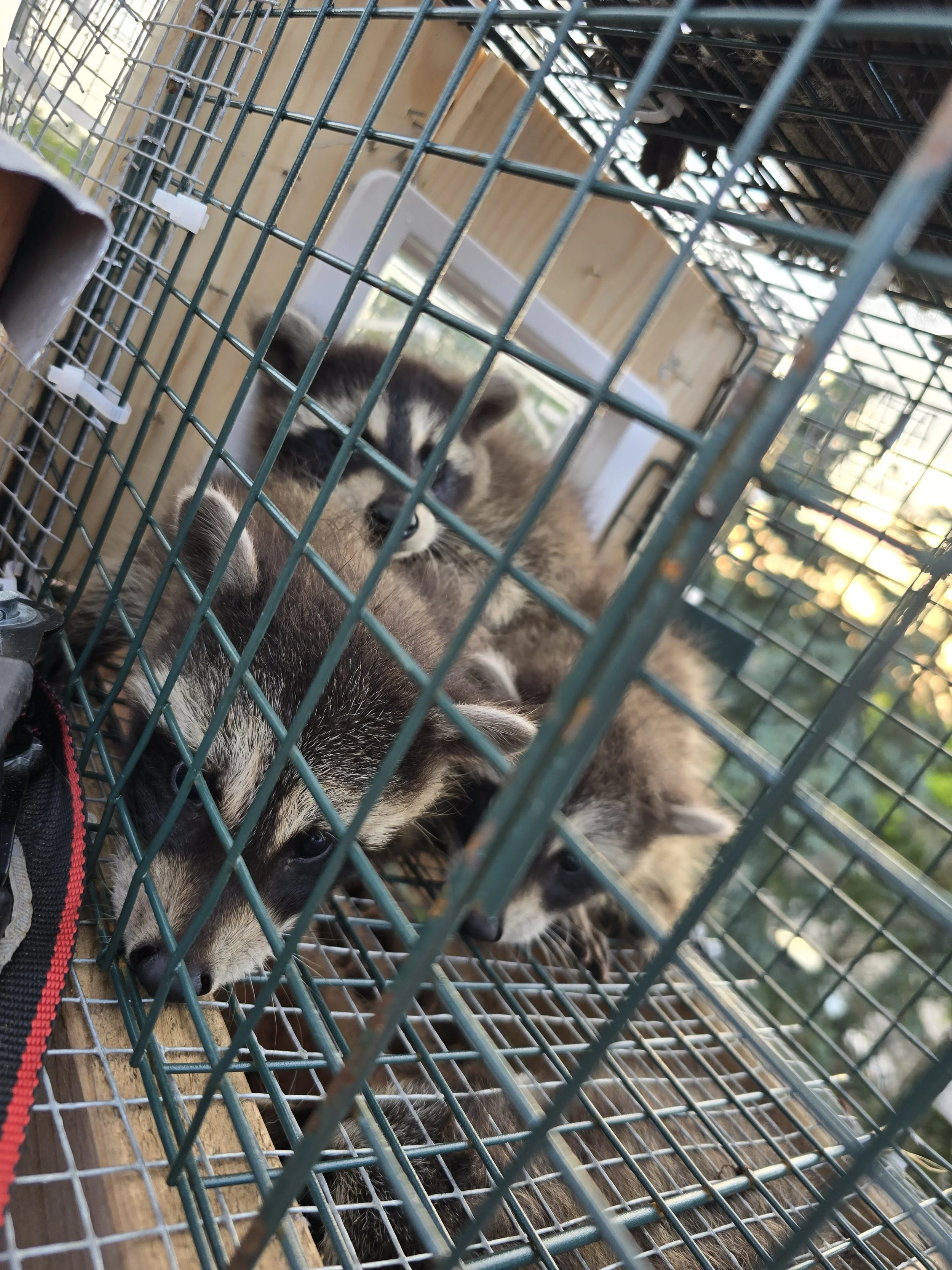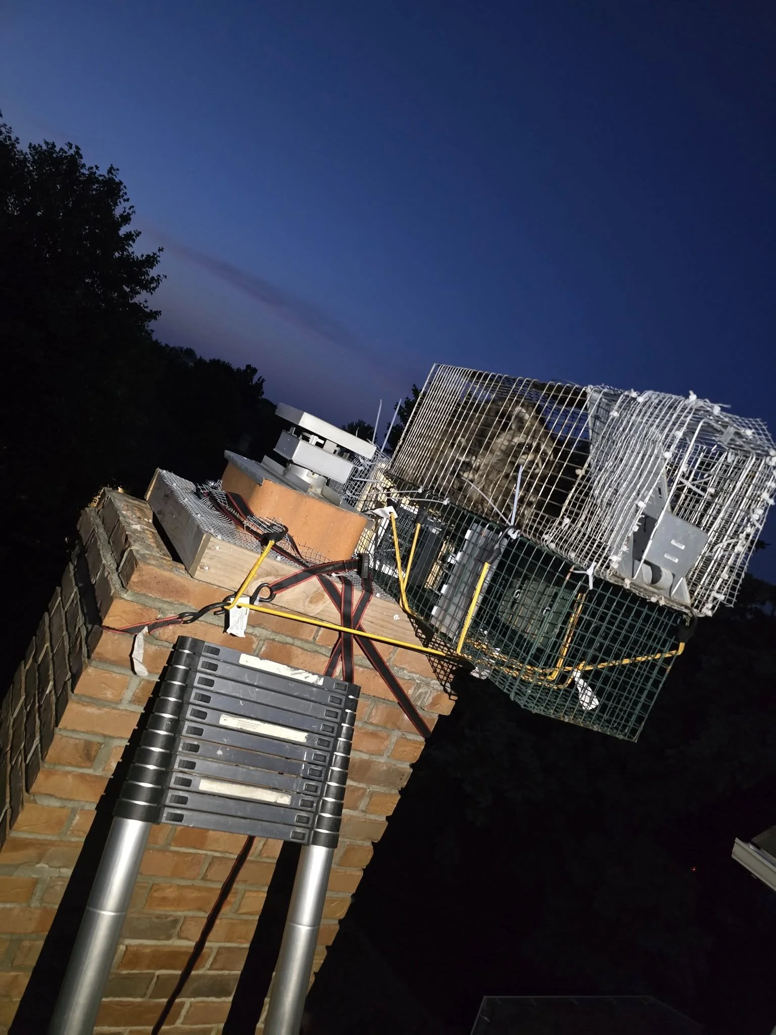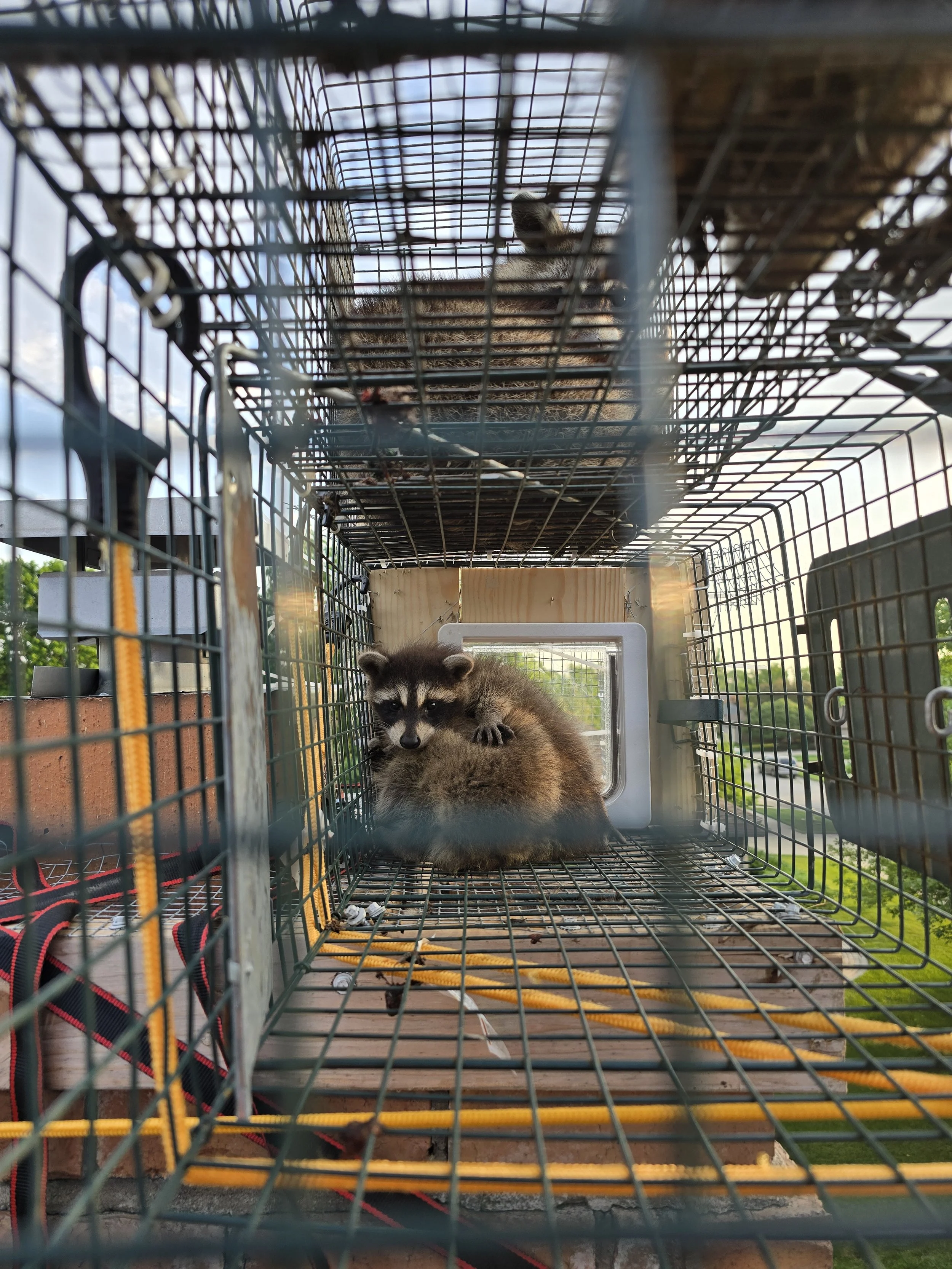 Within the first night, we caught Mom! When we when to pull the trap in the morning, we discovered there was five babies hiding in our chimney cradle as close to mom as they could get! Working fast, Alexander was able to grab two of the babies before they could bolt down. After reuniting the two capture kits with Mom on the ground, Alexander went back to work on getting the other three kits out.